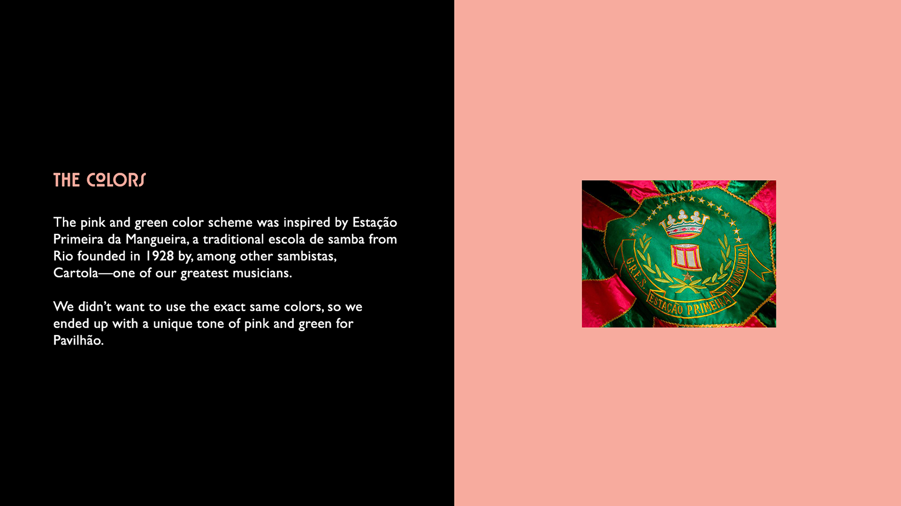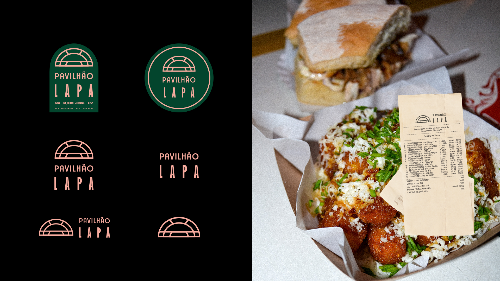 We knew we wanted to make something that stood the test of time, while still paying homage to the sambistas, rappers, and all musicians from before that made Lapa what it is. Taking inspiration from the building's Art Déco structure, the colors from a traditional escola de samba (samba school) from Rio, and other elements that reflected the culture from the city, I developed a full visual identity with logo, illustrations, menu, uniform, and other applications that brought to life the three main elements of Pavilhão: bar, culture, and gastronomy.